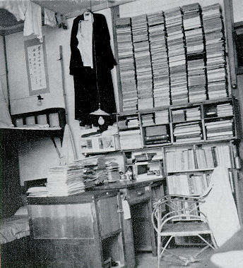 李敖在台大第一宿舍第四室的书桌、书架、和上铺床: